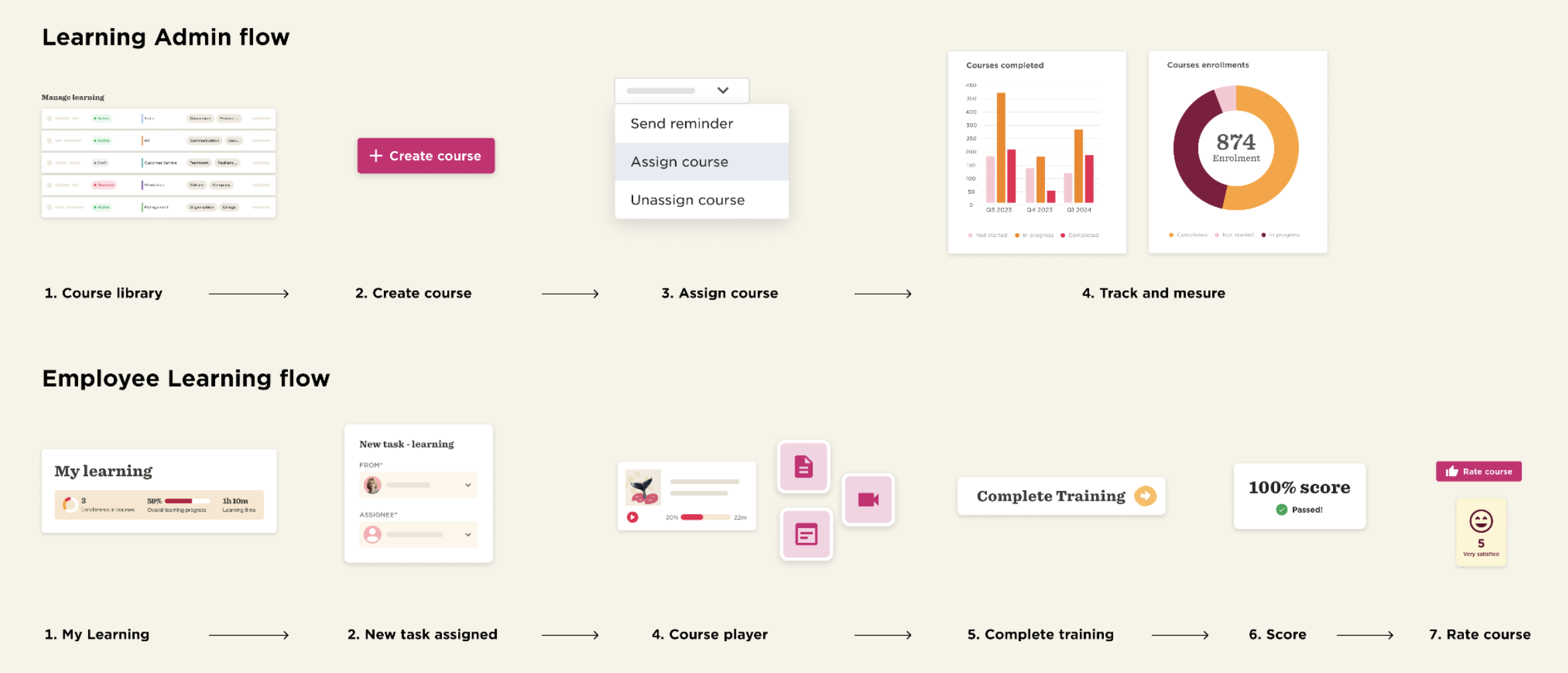Working closely with the Product Marketing and Content teams, I developed a creative direction that connects three meanings of "flow" simultaneously: the product's actual UX (the admin and employee learning journeys), the psychological state of being engaged and absorbed in learning, and a fluid organic texture that runs through every asset as a visual through-line.